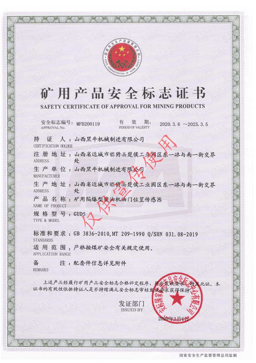 資質(zhì)證書 >配套件安標(biāo)證>礦用隔爆型柴油機(jī)油門位置傳感器